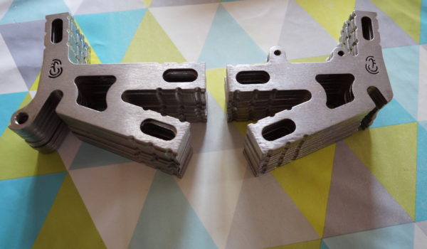 Le second prototype a donc commencé avec la conception des pattes et leur découpe par Toliroise à Brest. La géométrie choisie est légèrement plus longue que celle du premier vélo, l’empattement total passe de 1,3m à 1,43m. L’objectif est d’avoir un peu plus de place pour les 2 sièges enfants.
